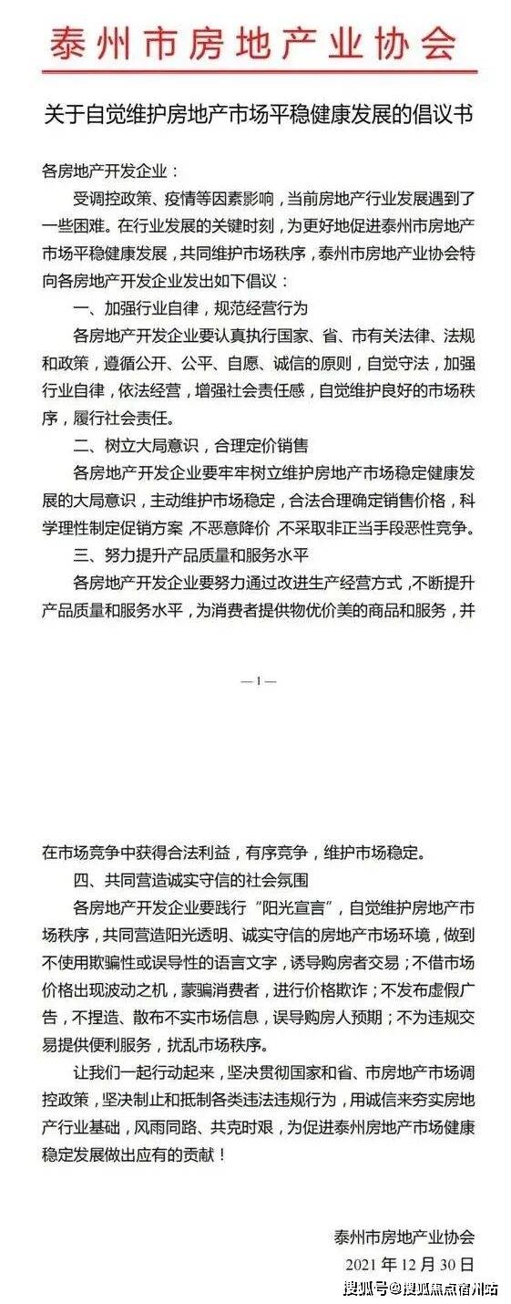 泰州市房地产业协会发布倡议书,要求房企“主动维护市场稳定,合法合理确定销售价格,不恶意降价”;